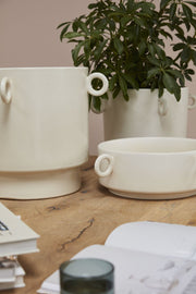 Beautiful as a centerpiece with florals or as a serving dish, the modern Yazu Bowl is a perfect oversized decorative accent piece & tabletop focal point. A sealed, food-safe interior allows for serving or can be filled with soil for a succulent collection. With its sturdy, weighted design, unique loop handles & an off-white semi reactive glaze, this ceramic sculptural vessel instantly elevates home decor with its neutral hue & artisanal look.
