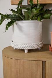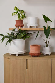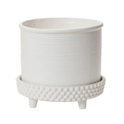 The terracotta finished in matte white of the Jane Footed Pot features embossed dots and stripes, elevating your favorite plants beyond ordinary. Suitable for outdoor or indoor use, it features a drainage hole and footed saucer.