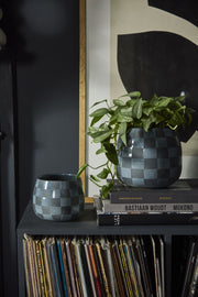 With its trendy checkerboard pattern & bold dark grey & black hues, the handmade solid glass Enthia Vase makes a statement, especially filled with bright contrasting florals or a 6-inch drop-in plant. The checkered sections alternate between frosted matte & shiny squares. The glass has a weighty feel & makes a sturdy home decor accent piece or large votive with a pillar candle on a shelf, console, or coffee table.