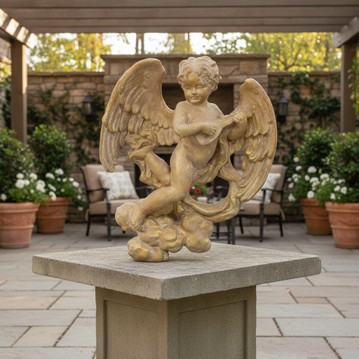 Musical Winged Cherub on Cloud Outdoor Statue (17-Inch)
